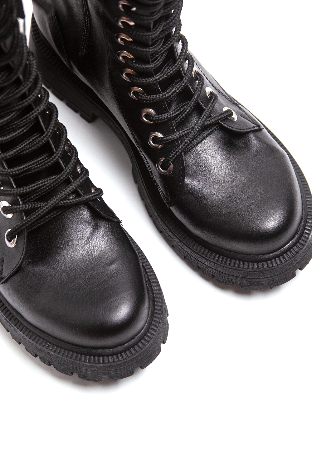 Borcegos confeccionados en ecocuero napa color negro. Tienen cordones y cierre en el lateral interno que facilita el calce., El interior está forrado con ecocuero y la suela es de goma.