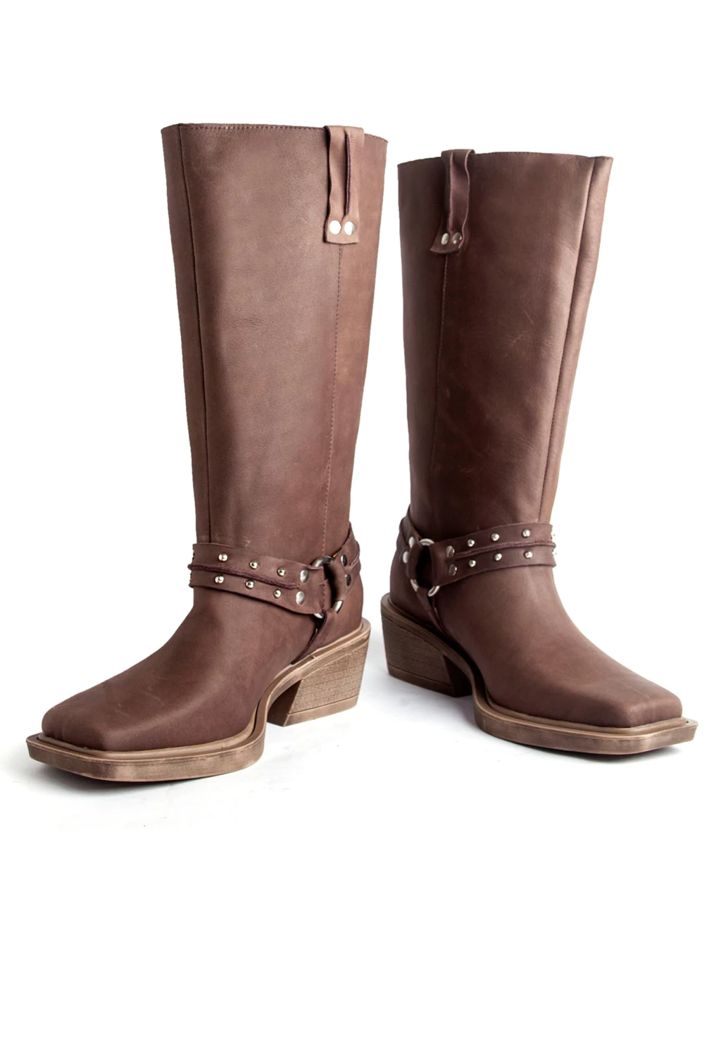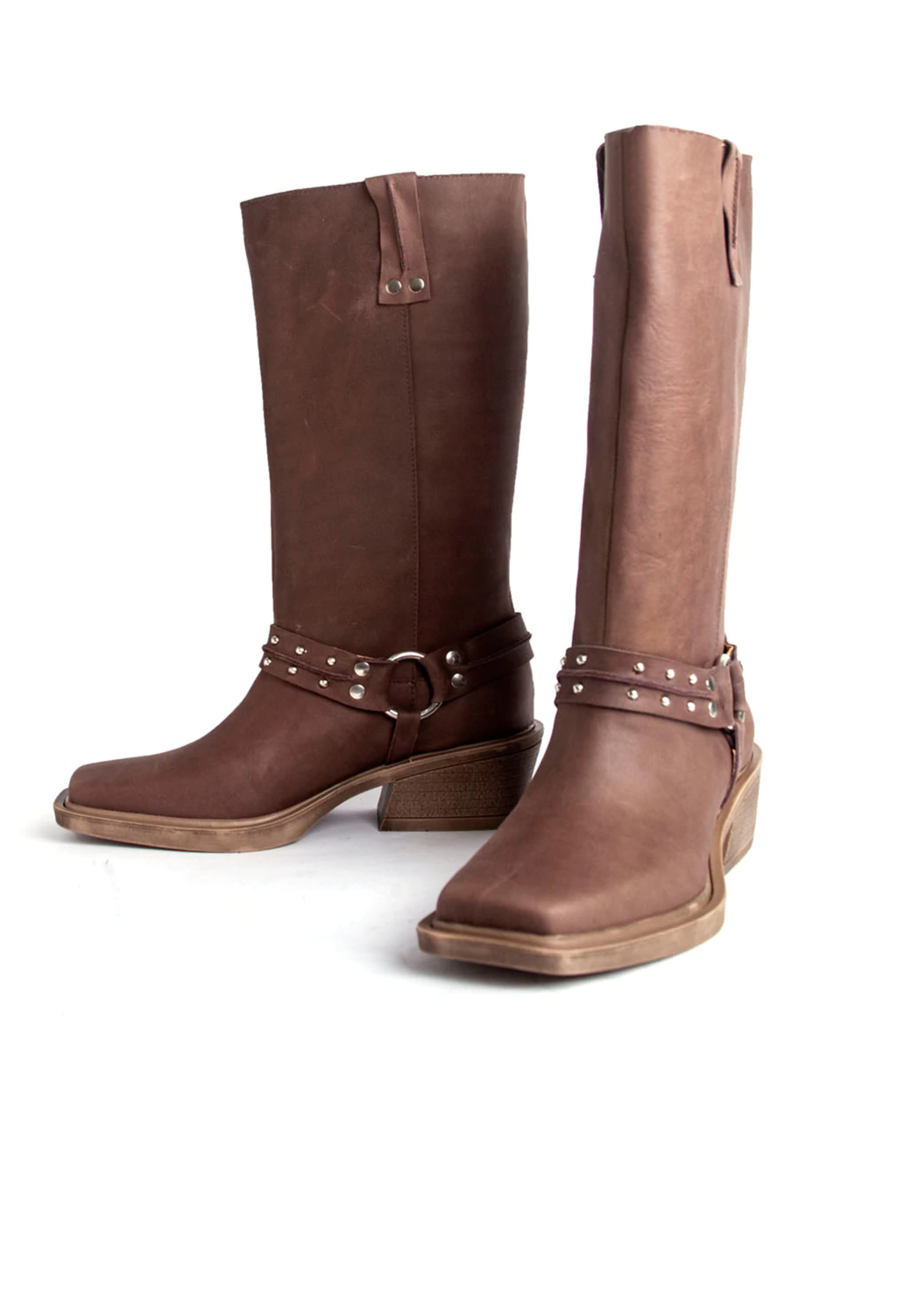 Descubrí el estilo y la comodidad de nuestras botas texanas en cuero color café. Con una caña de 31 cm, estas botas son un símbolo de distinción. La atractiva pulsera con herraje y tachas en color níquel añade un toque distintivo a cada paso.