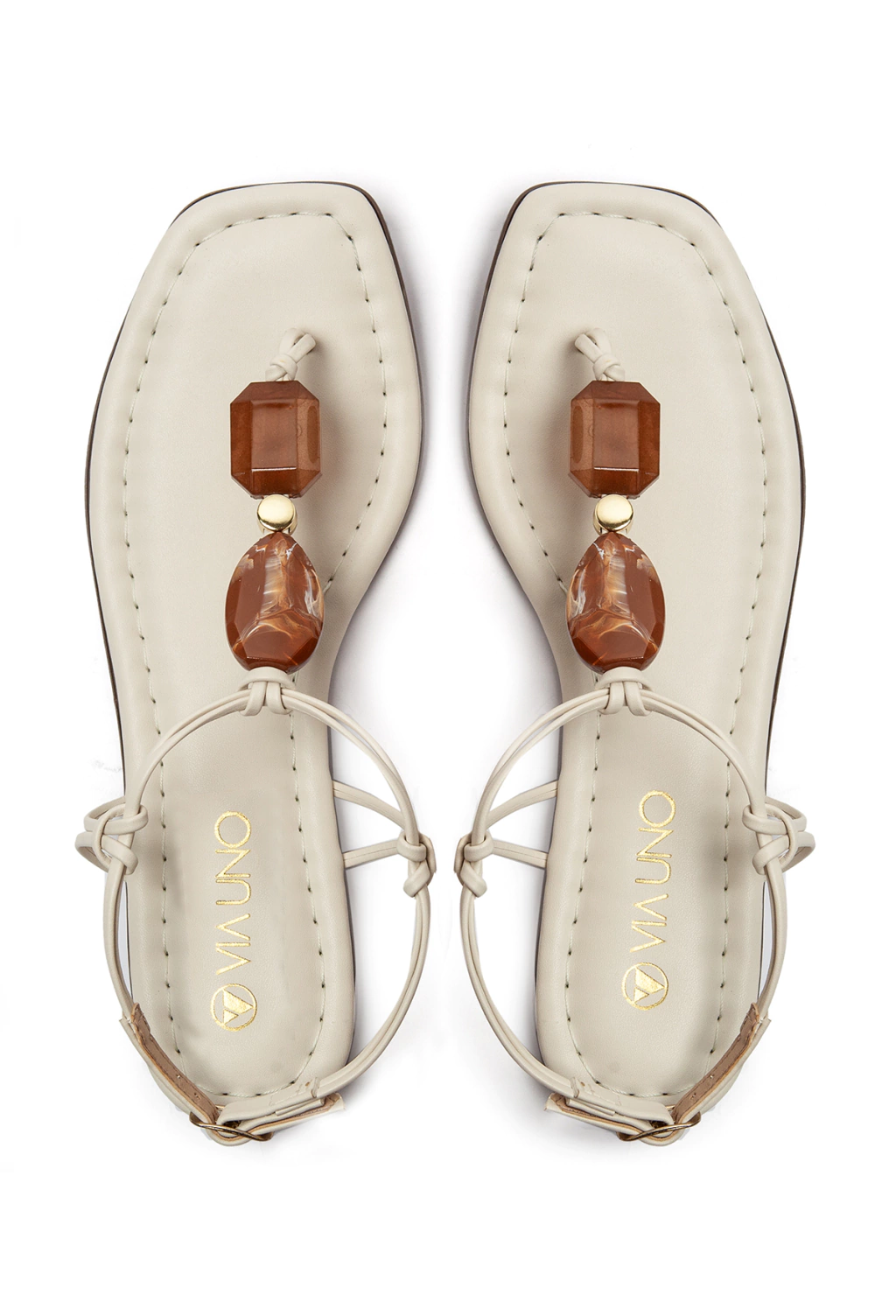 Sandalias planas confeccionadas en ecocuero napa color off white. La capellada está compuesta por una tira recta, una tira con adorno simil piedras y pulsera ajustable en el talón. La base es de goma.