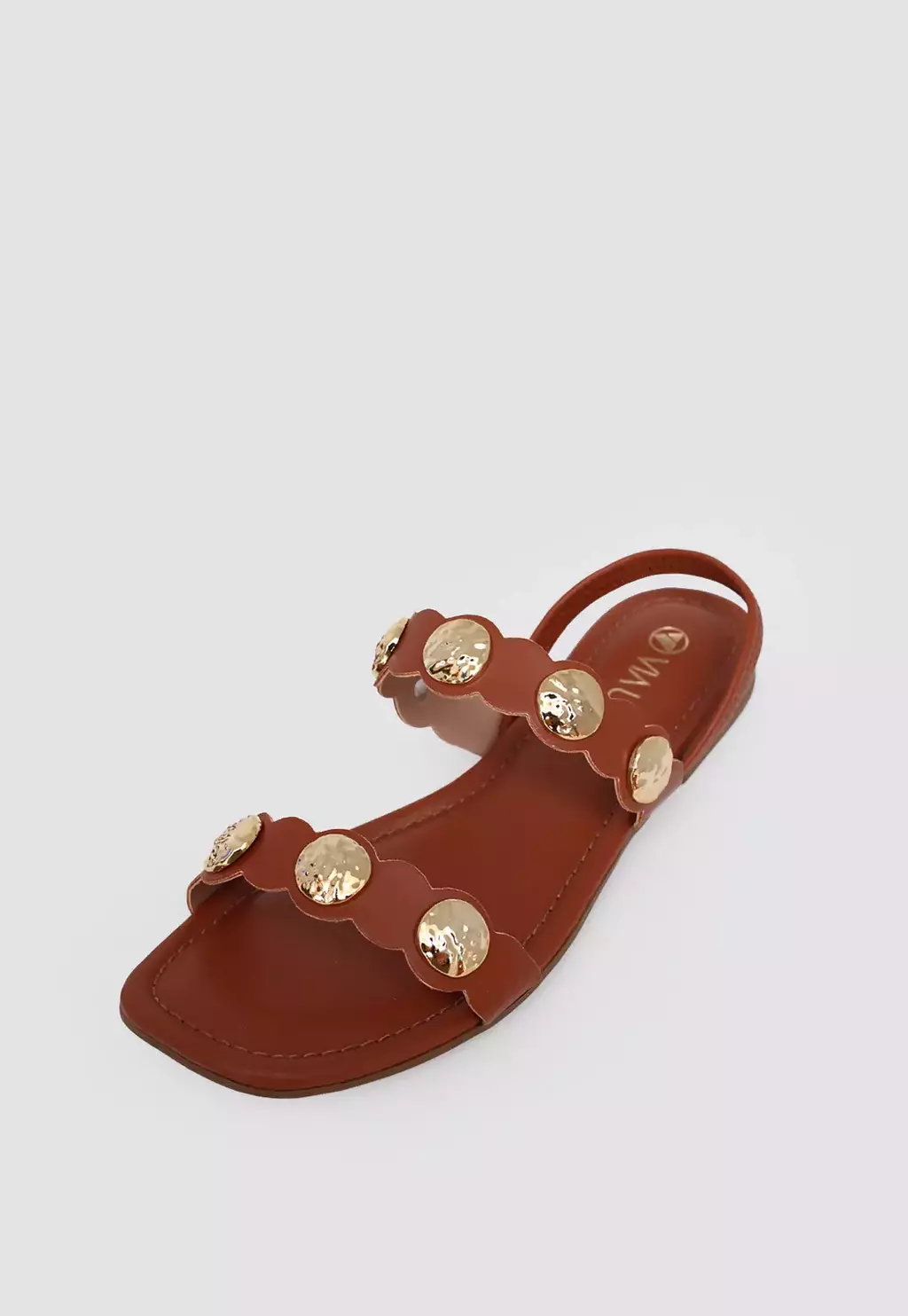 Sandalias planas confeccionadas en ecocuero napa color nuez, ideales para un look sofisticado y cómodo. La capellada cuenta con dos tiras adornadas con detalles dorados que aportan un toque de elegancia, complementadas con una pulsera ajustable en el talón para un calce perfecto.