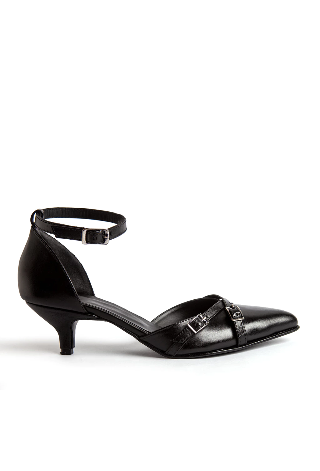 Estos stilettos están confeccionados en cuero napa, presentando un diseño sofisticado con dos tiras finitas y un delicado detalle de hebillas. Con un taco de 5 cm, ofrecen la altura perfecta para realzar tu figura, mientras que el talón cerrado y la pulsera ajustable en el tobillo garantizan un ajuste cómodo y seguro.