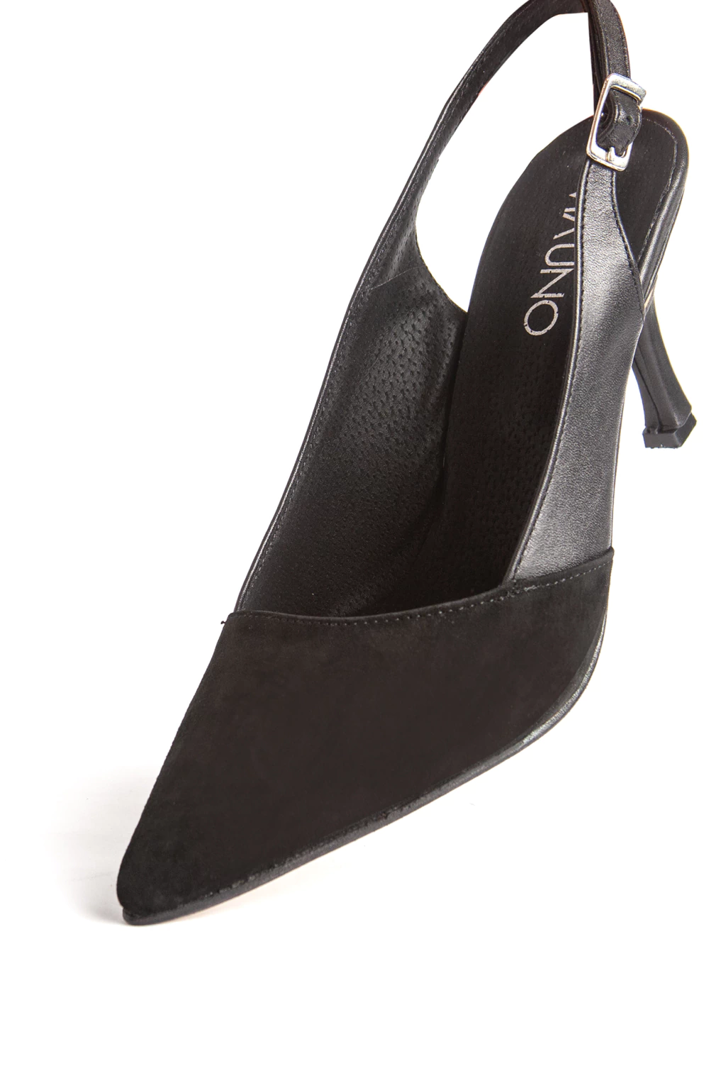 Stilettos combinado en gamuza y cuero napa color negro. Tienen el talón descubierto y taco de 9 cm. Interior forrado con símil cuero. Los stilettos aportan sofisticación a tus jeans, elegancia a tus pantalones sastre y sensualidad a tus polleras ¡Animáte a este clásico!
