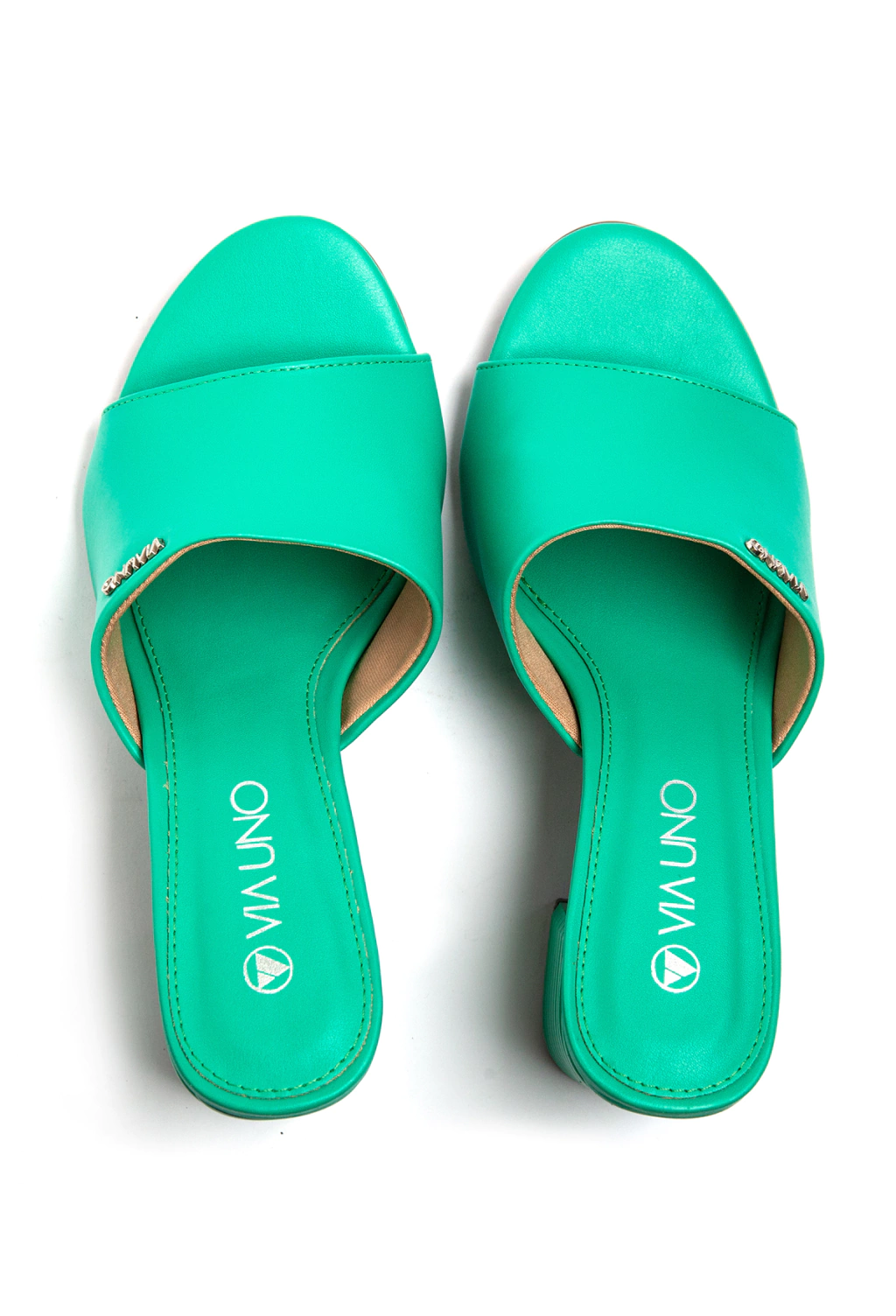 Zuecos confeccionados en ecocuero napa color verde. Su capellada está compuesta por una tira ancha acolchada, muy suavecita. El taco es pintado y la base es de goma.